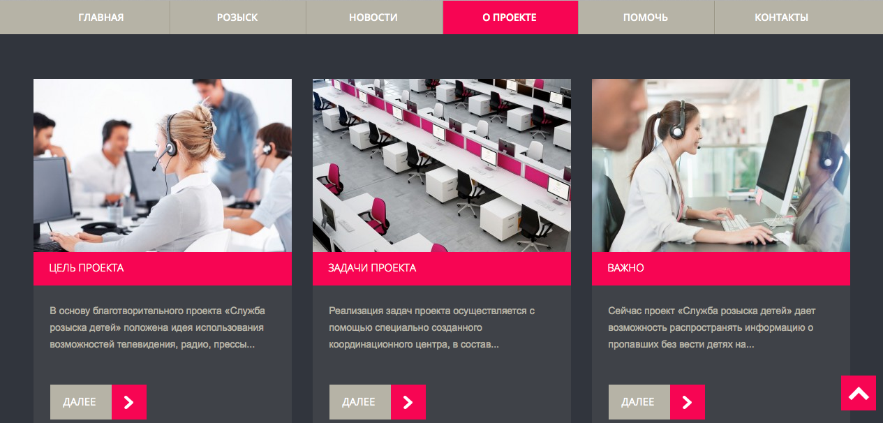 «Служба розыска детей» – это информационный, волонтёрский социальный проект. В основе осуществления поставленной цели лежит идея объединения возможностей телевидения, радио, прессы, наружной рекламы и сети интернет для оперативного розыска пропавших детей на территории Московской области. Семьям, обратившимся в колл-центр, оказывается безвозмездная помощь в розыске пропавшего ребёнка.